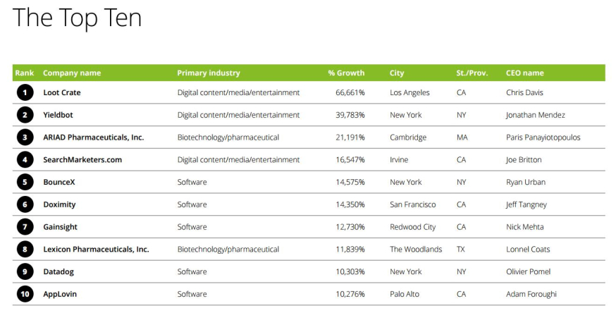 De top tien van de 500 snelst groeiende Amerikaanse techbedrijven zag er zodoende als volgt uit.