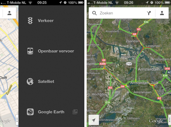Rechtsonder in beeld zit nog een kleine knop, waarmee je een viertal weergave-opties benadert. Je kunt overigens ook met twee vingers naar links 'swipen'. Klik je de optie 'verkeer' aan, dan krijg je direct een actuele status van de verkeersdrukte op snelwegen en andere doorgaande wegen te zien. Handig, want voortaan zit er een volwaardige navigatie-functie in de app. Deze houdt uiteraard rekening met de verkeersdrukte in zijn berekeningen. De navigatie maakt gebruik van gesproken aanwijzingen en blijft werken ook als je de app enkel op de achtergrond hebt draaien.