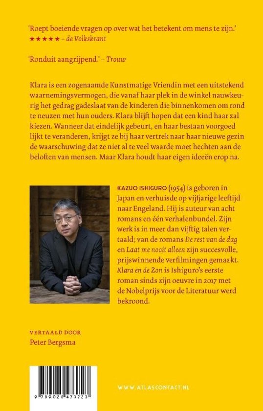 ‘Klara en de Zon’ is een adembenemende roman van Nobelprijswinnaar Kazuo Ishiguro – schrijver van ‘Laat me nooit alleen’ en Booker Prize-winnaar ‘De rest van de dag’. Klara is een robot. Ze is een zogenaamde 'Kunstmatige Vriendin' met een uitstekend waarnemingsvermogen, die vanaf haar plek in de winkel nauwkeurig het gedrag gadeslaat van de kinderen die binnenkomen om rond te neuzen met hun ouders. Klara blijft hopen dat een kind haar zal kiezen. Wanneer dat eindelijk gebeurt, en haar bestaan voorgoed lijkt te veranderen, krijgt ze bij haar vertrek naar haar nieuwe gezin de waarschuwing dat ze niet al te veel waarde moet hechten aan de beloften van mensen. Maar Klara houdt haar eigen ideeën erop na. ‘Klara en de Zon’ gunt ons een blik op onze veranderende wereld door de ogen van een onvergetelijke buitenstaander. Zoals vaker in zijn vindingrijke, verfijnde, aangrijpende boeken onderzoekt Kazuo Ishiguro ook hier wat het betekent om écht van iemand te houden.