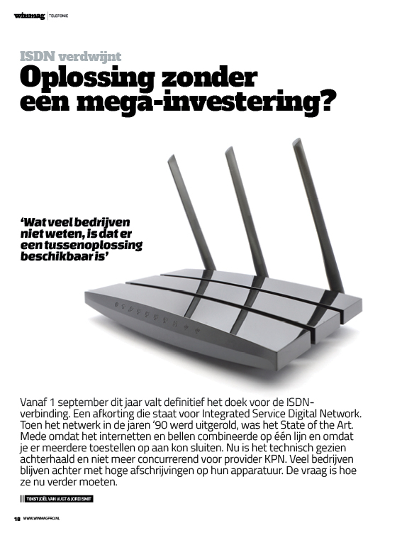 Vanaf 1 september dit jaar valt definitief het doek voor de ISDNverbinding. Een afkorting die staat voor Integrated Service Digital Network. Toen het netwerk in de jaren ‘90 werd uitgerold, was het State of the Art. Mede omdat het internetten en bellen combineerde op één lijn en omdat je er meerdere toestellen op aan kon sluiten. Nu is het technisch gezien achterhaald en niet meer concurrerend voor provider KPN. Veel bedrijven blijven achter met hoge afschrijvingen op hun apparatuur. De vraag is hoe ze nu verder moeten.